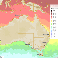 K'gari: Low to mid 20s, 1-9°C, Light winds becoming easterly 15-20 km/h, Slight chance of shower, Partly cloudy with patches of frost and chance of fog inland in the morning.
