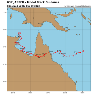 Severe Tropical Cyclone 03P (Jasper), located approximately 561 nautical miles (about 1,039 kilometers) east of Cairns, Australia, has been tracking south-southwestward at a speed of 7 knots over the past six hours. As of 4:00 PM, the minimum central pressure is 970 hPa, and the maximum significant wave height recorded at the same time is 30 feet. The system is weakening and upper levels of cloud covering the visible circulation. I included the GFS long-range forecast to provide an idea of where it will go after it crosses, only because this is a very common path. However I am not confident the ridge will push the system as far North as currently expected.