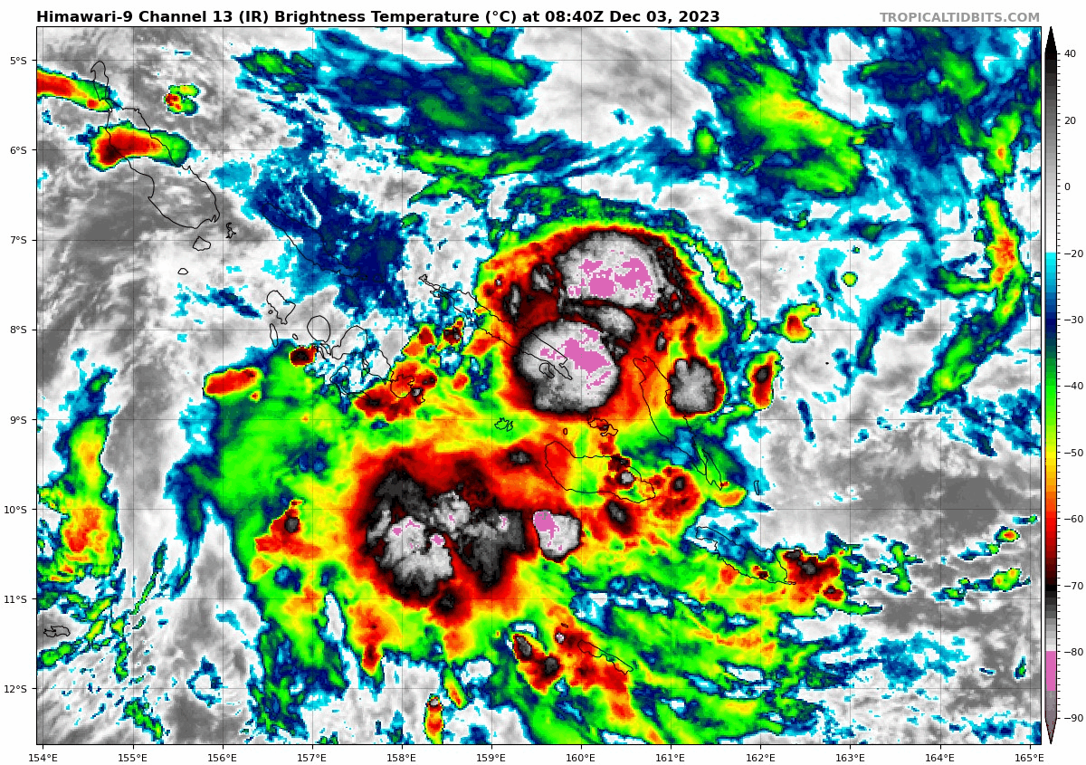 The weather system known as INVEST 92P, which was initially near the Solomon Islands, northeast of Honiara, Guadalcanal. Satellite images and microwave data show a broad, partially exposed low-level circulation center with disorganized flaring convection. Environmental analysis suggests favorable conditions for development, including good upper-level outflow, low vertical wind shear (10-15 knots), and warm sea surface temperatures (29-30°C). However, the system's development may be hindered by interaction with land as it moves over the Solomon Islands. Global models predict that 92P will move westward over the next 48 hours and continue to develop. The estimated maximum sustained surface winds are 15 to 20 knots, and the minimum sea level pressure is around 1006 mb. There is a medium likelihood of it becoming a significant tropical cyclone in the next 24 hours.