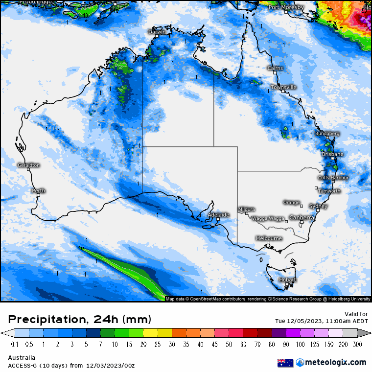 Troughs potentially bringing showers & storms to WA, NT Top End & far north QLD, also directing hot winds into SA and WA. A front expected to bring showers and brisk winds to TAS. High pressure likely to keep the southern mainland mostly dry.