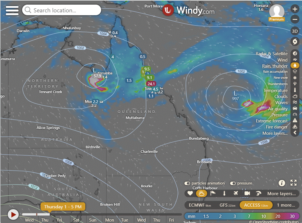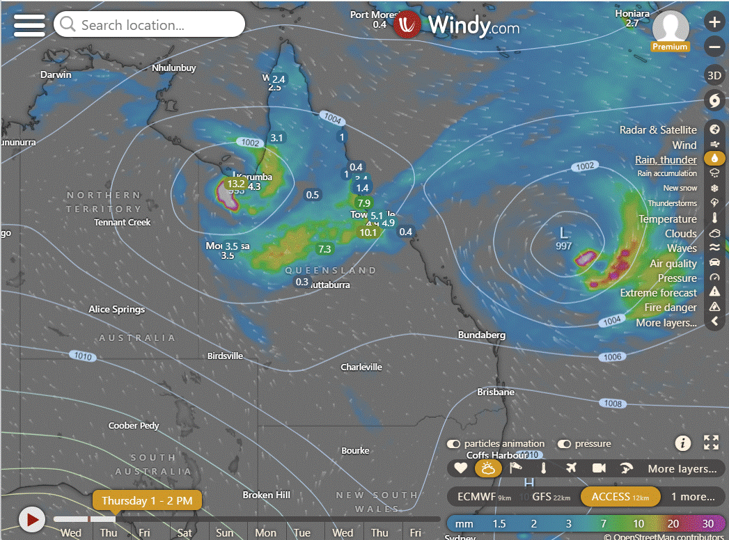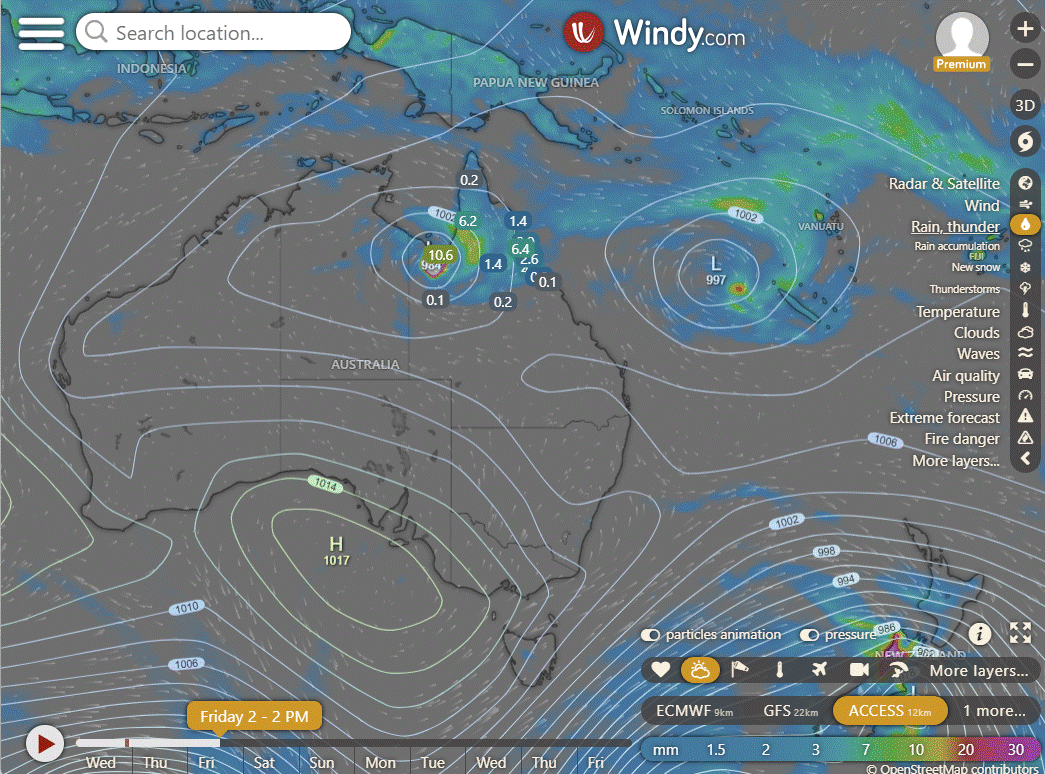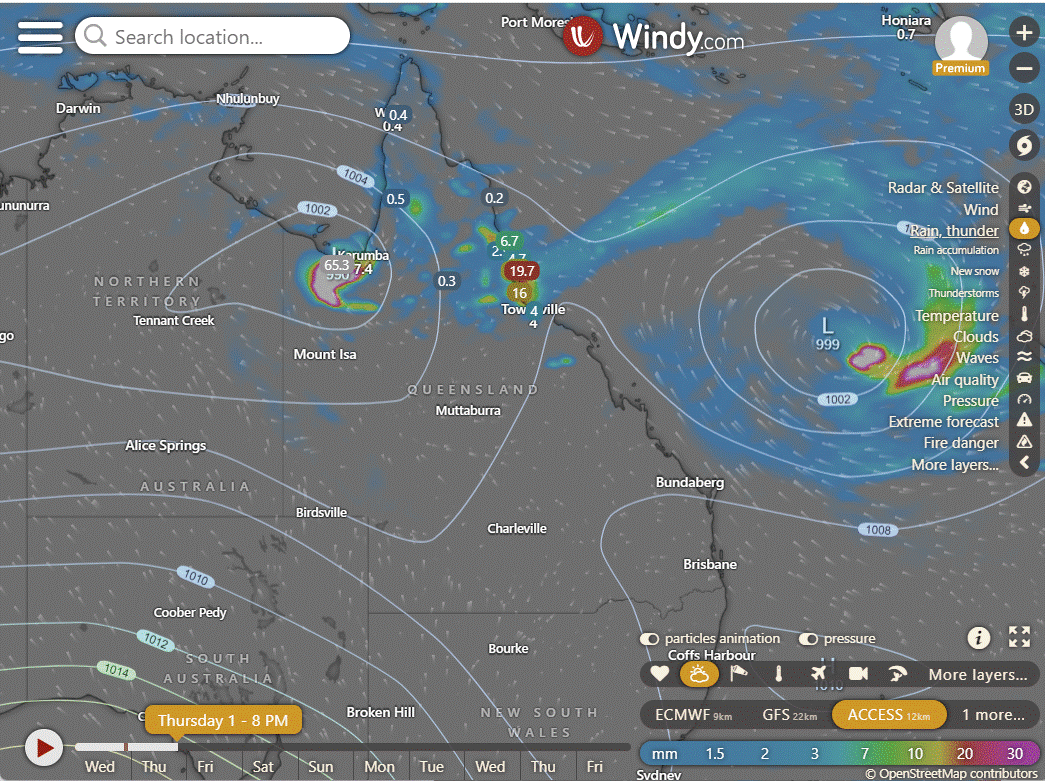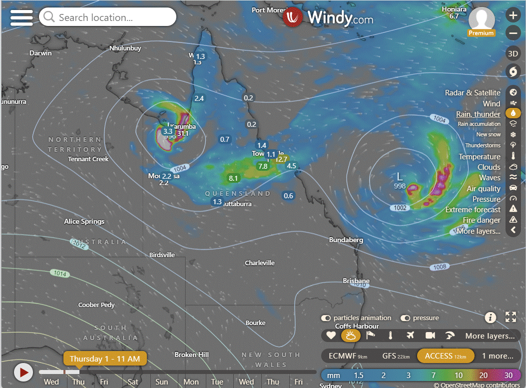 The movement of Ex TC Kirrily showing below with the 3 major models. The intensity is the main factor. But the NW should expect heavy rain that could lead to flooding. We still can't look more than 2 days ahead with this, the models change a lot between Friday and Saturday. There is an interplay between the new ECL 06U off the coast of QLD and Ex TC Kirrily which means they will influence each other. Not sure how yet.