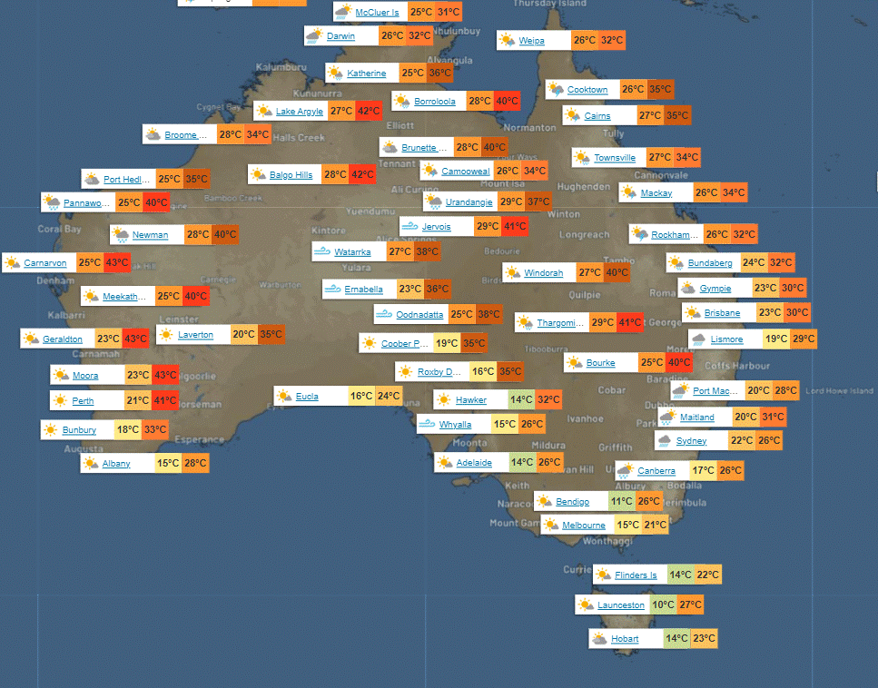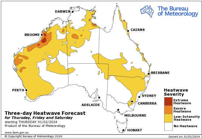 Heatwave Warning for Western Australia, Northern Territory, and Queensland.