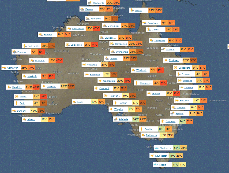 Max temperature: 33 to 41°C, Min temperature: low to mid 20s°C, Wind: Light winds becoming northeasterly 15 to 20 km/h, Rainfall: None, Other: Sunny.