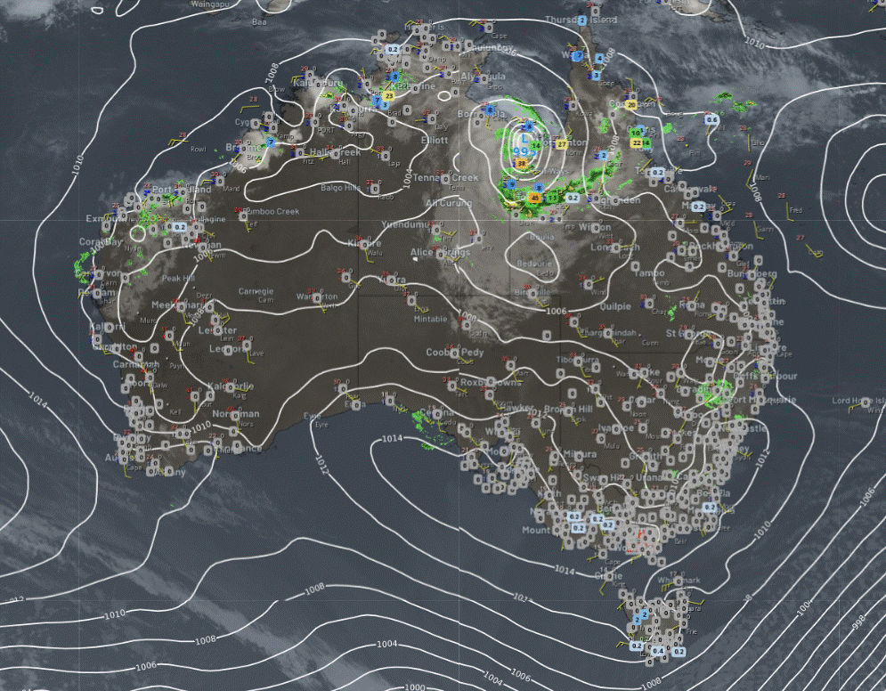A low and troughs will bring rain, showers, and storms to north QLD, NT Top End, and northern WA, with the heaviest rainfall expected in NW QLD near the low. Troughs will broaden across the interior, causing heat to spread east and south. A front will bring cooler gusty winds to southern WA and later TAS.