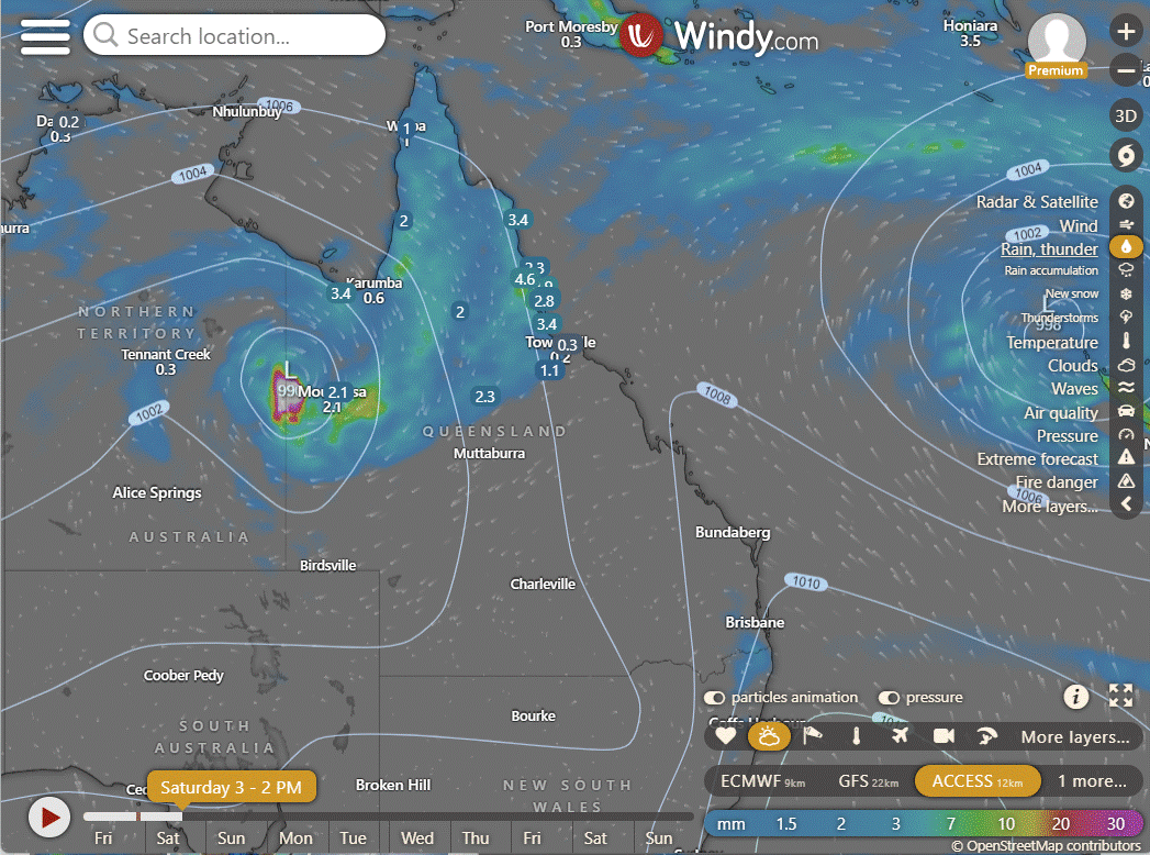 Saturday: Scattered showers and storms north of Winton to Bowen, possibly severe with heavy rain. Widespread showers in Gulf Country with heavy rain and strong winds from ex-Tropical Cyclone Kirrily. Clear elsewhere. Light to moderate east to southeast winds in southern and central Queensland. Moderate to fresh north to northwest winds in far north and northwest, with possible gale force winds along the Gulf Coast and islands.
