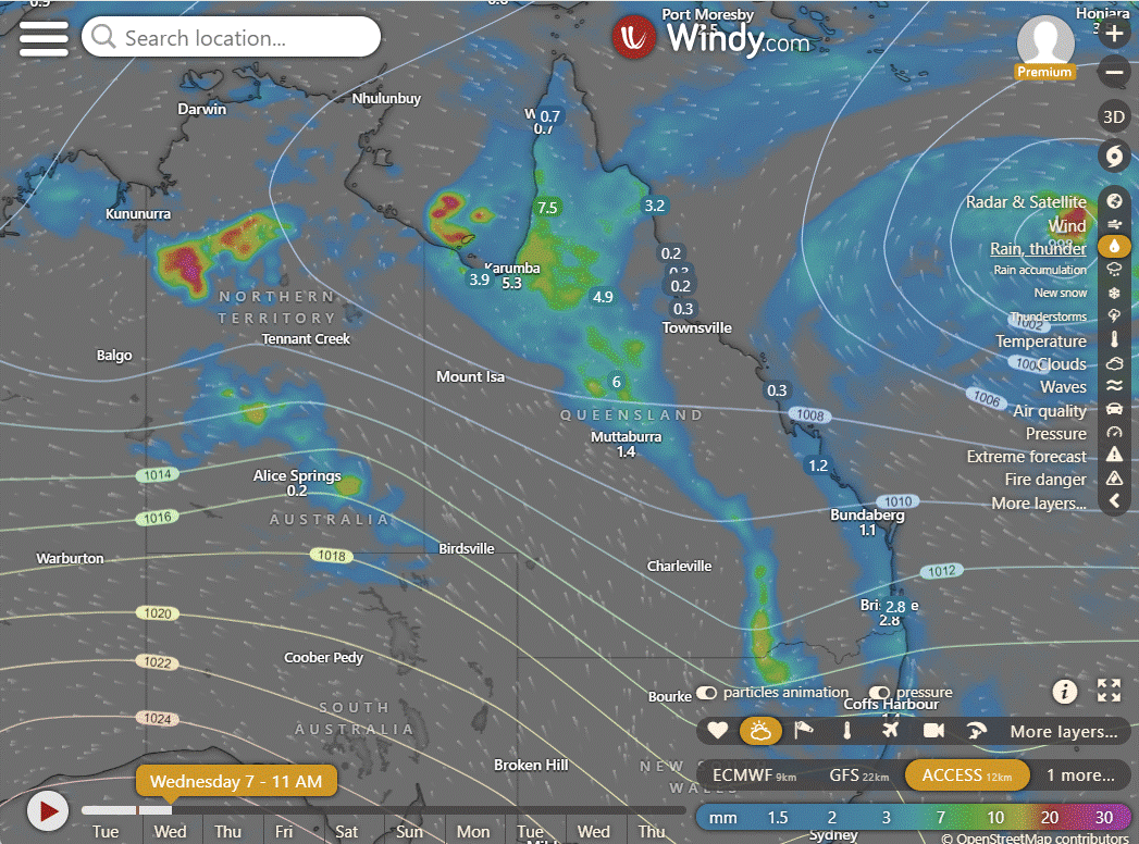 Wednesday: Scattered showers and thunderstorms in interior and northern Queensland north of Townsville, isolated in southwest Queensland. Severe thunderstorms with heavy falls on the Atherton Tablelands and Northern Gold Fields and Upper Flinders. Partly cloudy in eastern districts south of Bowen, isolated showers returning to South East Coast in late evening. Light northeast winds in east, tending northwest in Far North. Moderate southeast to southwest winds in western Queensland.